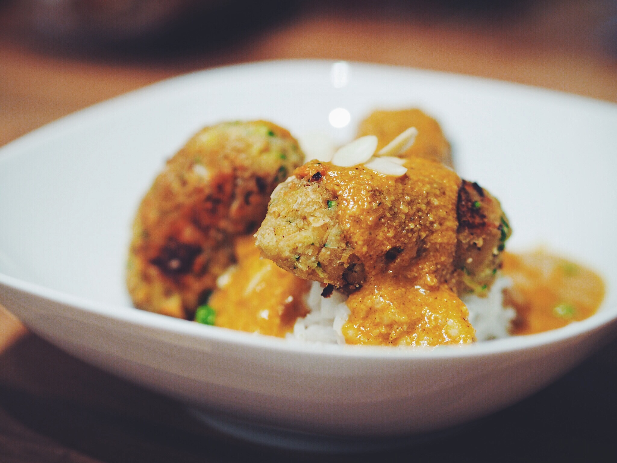5. Während die Soße köchelt, kann man aus der Koftamasse etwa 12 Nocken formen und in einer Pfanne mit etwas Kokosöl anbraten. Die Erbsen kurz vor dem Servieren unter die Soße rühren und durcherhitzen