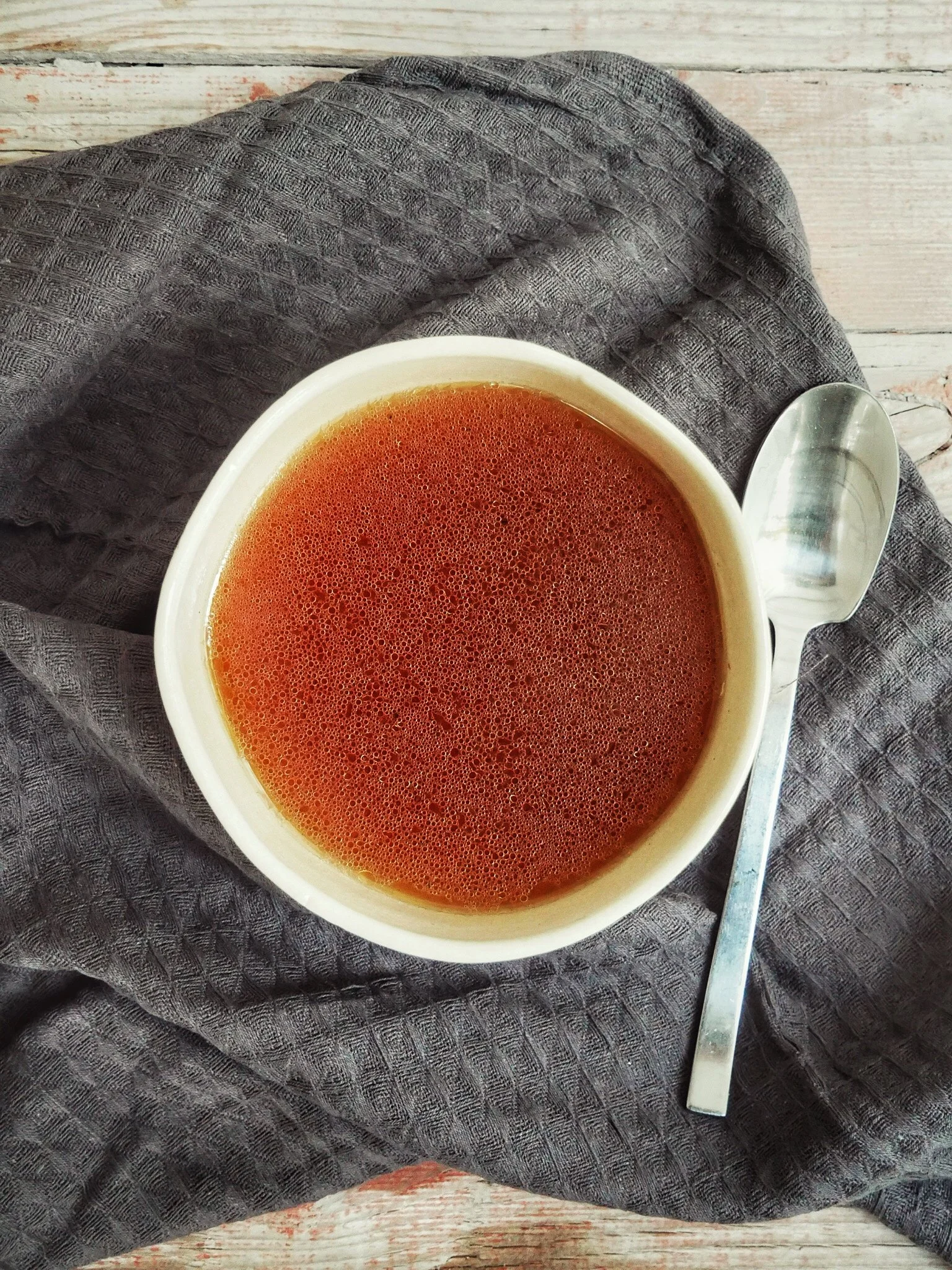 Die fertige Brühe hält sich für ca. 1 Woche im Kühlschrank. Alternativ kann sie portionsweise eingefroren werden